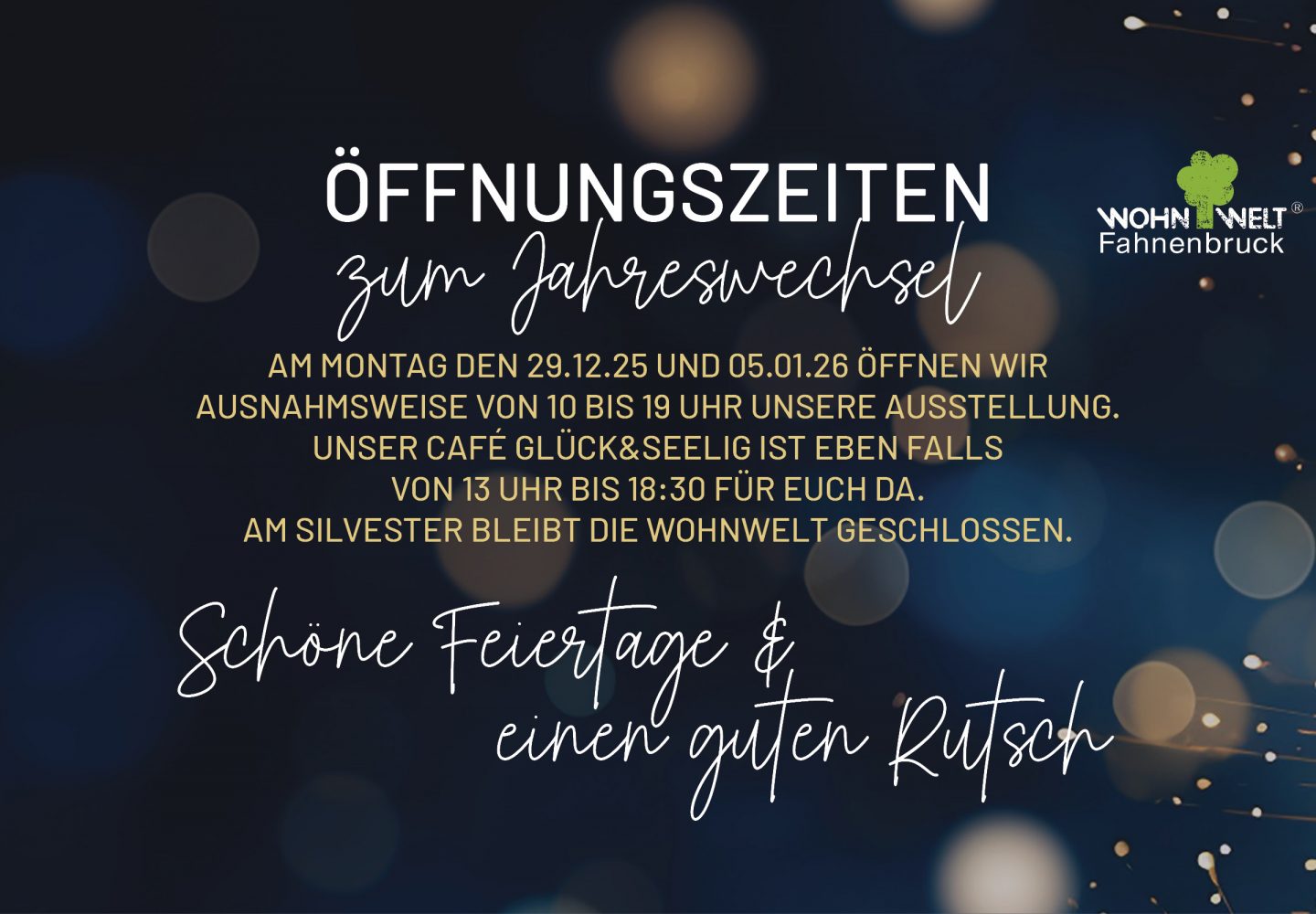 Unsere Öffnungszeiten rund um die FeiertageZwischen Weihnachten und Silvester haben wir ausnahmsweise auch am Montag, den 29. Dezember für dich geöffnet – so kannst du ganz entspannt bei uns vorbeischauen.Bitte beachte: An Silvester bleibt unsere gesamte Wohnwelt geschlossen.Zum Jahresstart sind wir wieder wie gewohnt für dich da und öffnen zusätzlich...